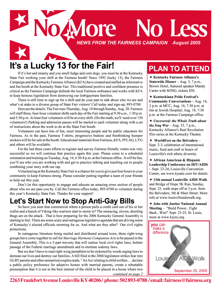 NEWS FROM THE FAIRNESS CAMPAIGN It's a Lucky 13 for the Fair! If its hot and steamy, and you smell fudge and corn dogs, you must be at the Kentucky State Fair working your shift at the Fairness booth!