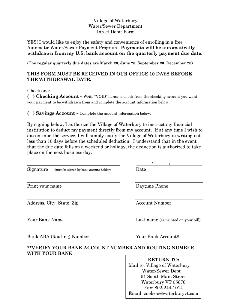 Any resident or property owner in Waterbury, Vermont, can use the Waterbury Direct Debit Form to enroll in the automatic water/sewer payment program.
