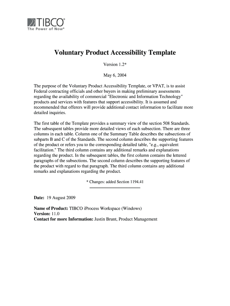 The document serves as a Voluntary Product Accessibility Template (VPAT) for TIBCO iProcess Workspace, assessing its compliance with Section 508 accessibility standards.