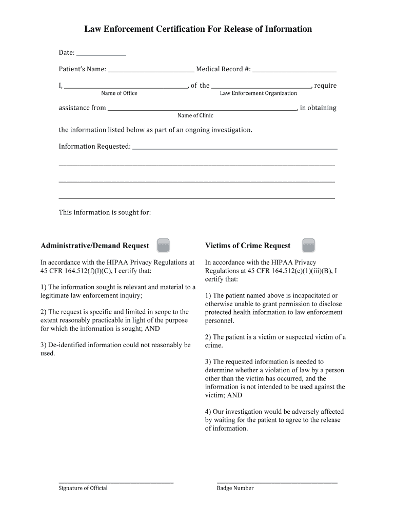 Law Enforcement Certification For Release of Information Date: Patients Name: Medical Record #: I, of the , require Name of Office Law Enforcement Organization assistance from
