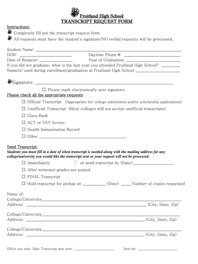 Get the free Btranscriptb request bformb - Fruitland bSchoolb District - fruitlandschools