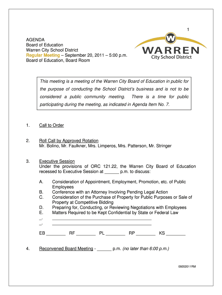 1 AGENDA Board of Education Warren City School District Regular Meeting September 20, 2011 5:00 p.m. Board of Education, Board Room This meeting is a meeting of the Warren City Board of Education
