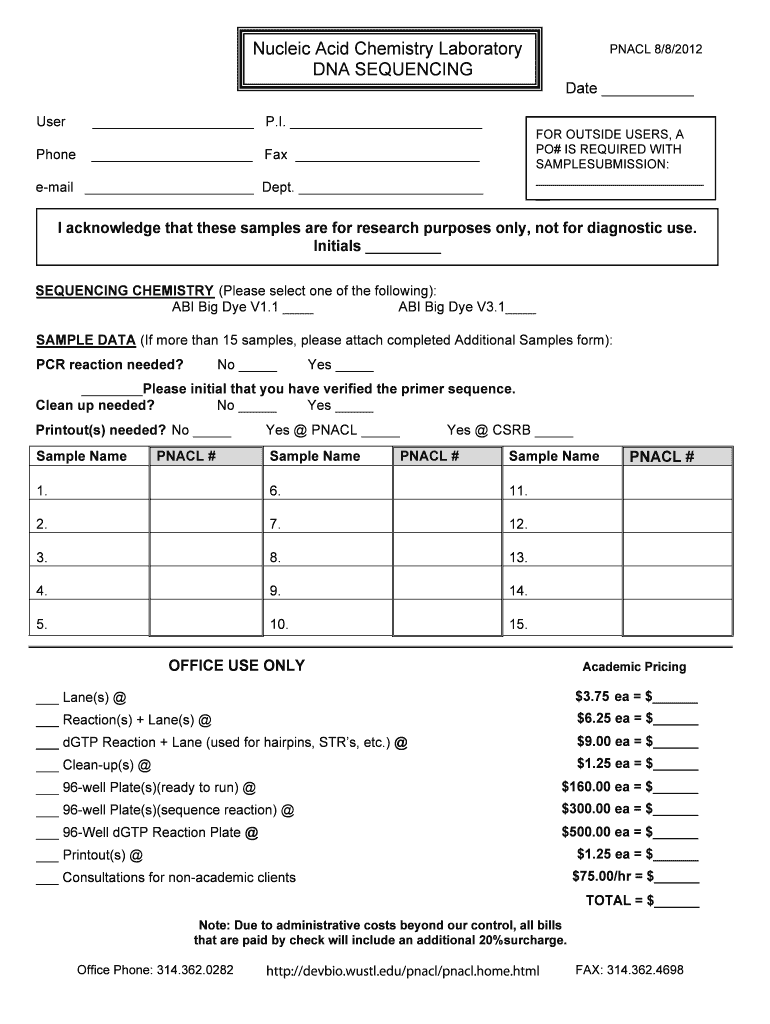 Nucleic Acid Chemistry Laboratory DNA SEQUENCING User P.I. Phone Fax PNA CL 8×8/2012 Date FOR OUTSIDE USERS, A PO# IS REQUIRED WITH SAMPLESUBMISSION: email Dept. I acknowledge that these samples
