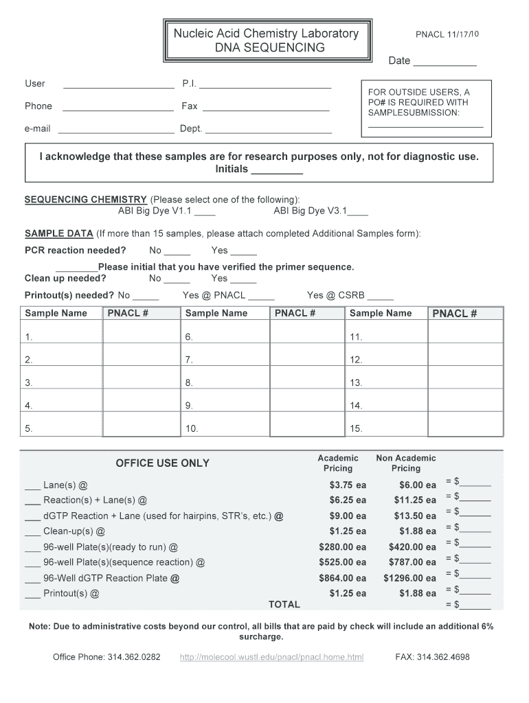 Nucleic Acid Chemistry Laboratory DNA SEQUENCING User P.I. Phone Fax PNA CL 11 17 10 Date FOR OUTSIDE USERS, A PO# IS REQUIRED WITH SAMPLESUBMISSION: email Dept. I acknowledge that these samples are