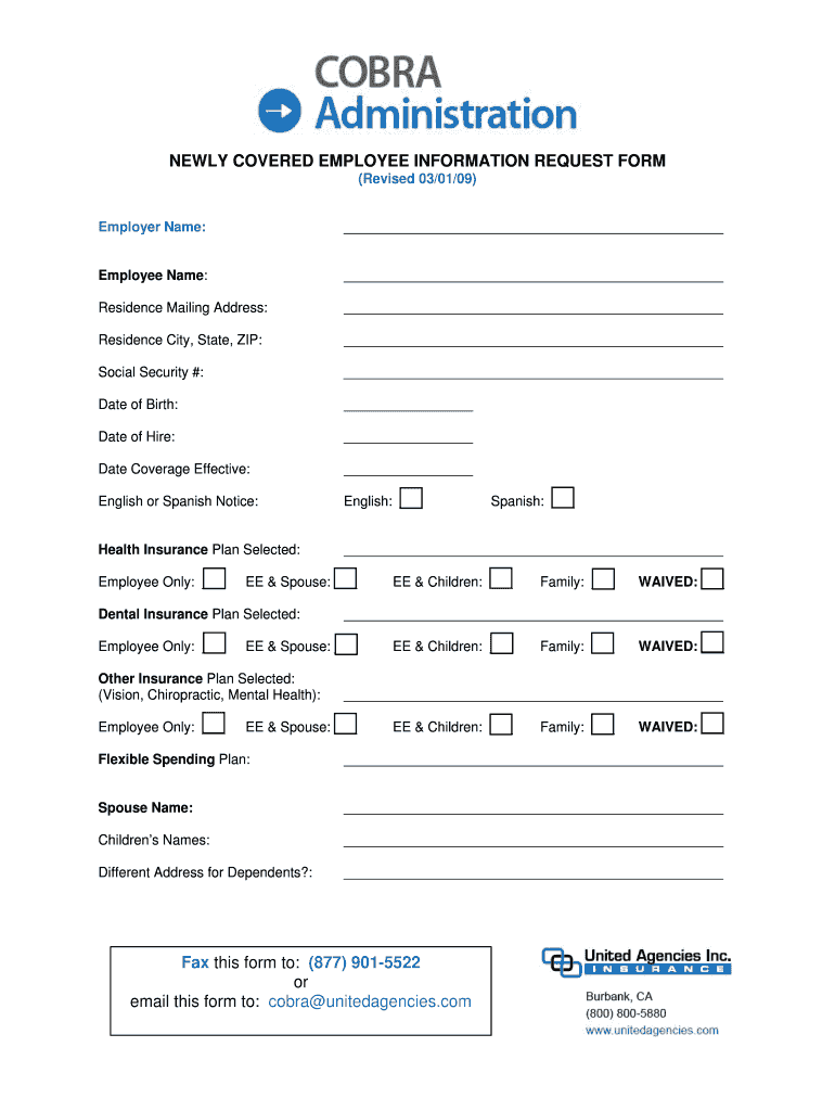 NEWLY COVERED EMPLOYEE INFORMATION REQUEST FORM (Revised 03 01/09) Employer Name: Employee Name: Residence Mailing Address: Residence City, State, ZIP: Social Security #: Date of Birth: Date of Hire: