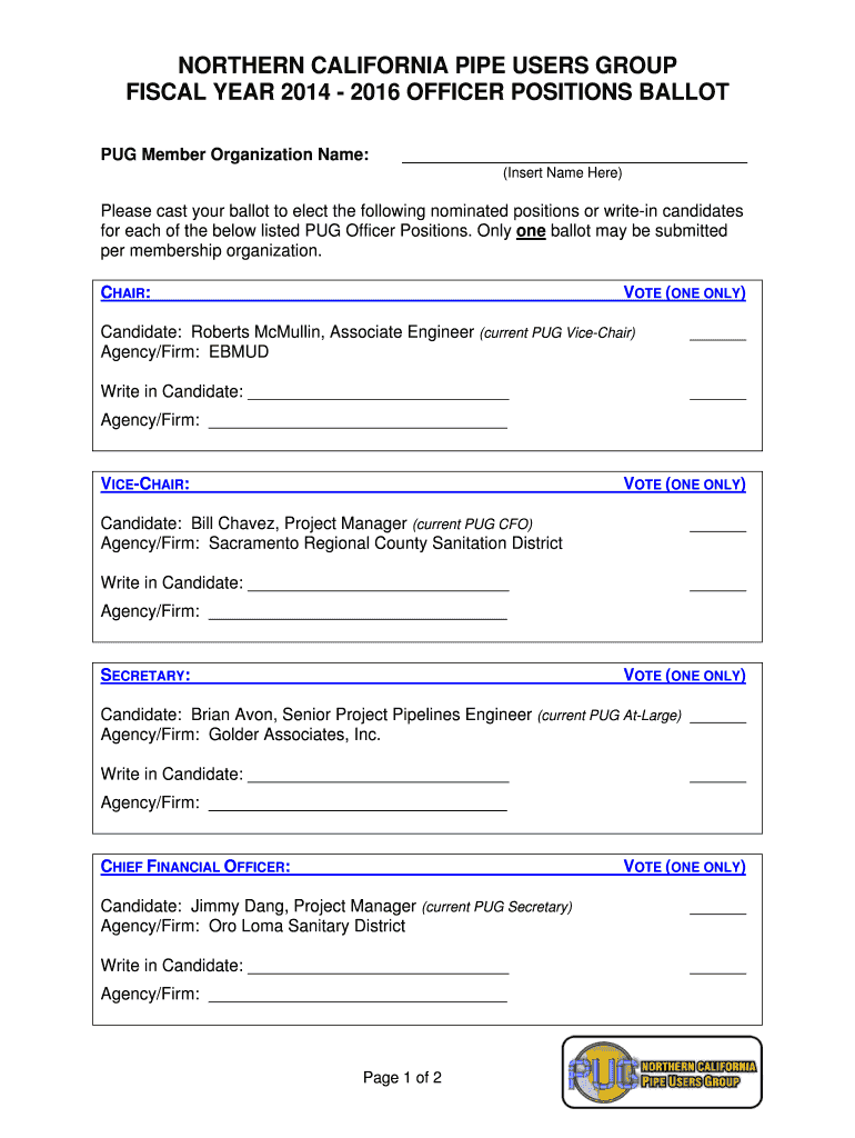 NORTHERN CALIFORNIA PIPE USERS GROUP FISCAL YEAR 2014 2016 OFFICER POSITIONS BALLOT PUG Member Organization Name: (Insert Name Here) Please cast your ballot to elect the following nominated positions