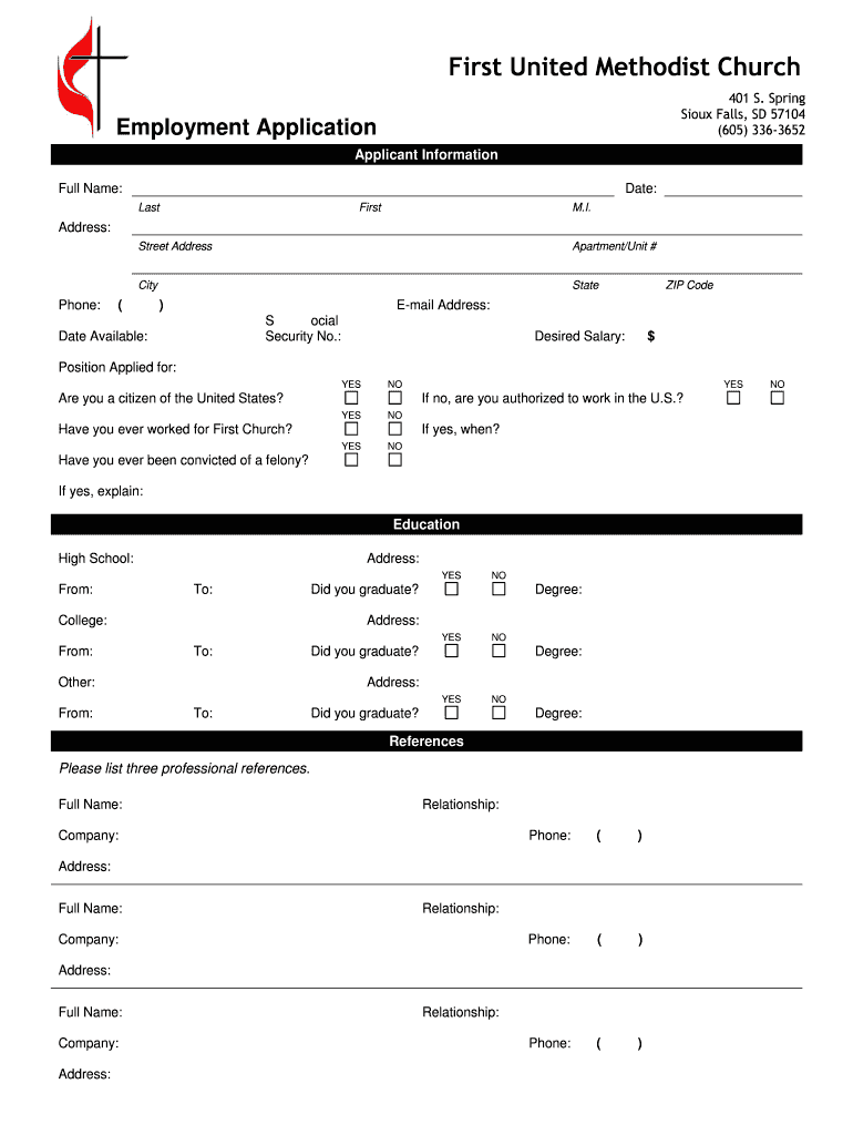 First United Methodist Church 401 S. Spring Sioux Falls, SD 57104 605 3363652 Employment Application Applicant Information Full Name: Date: Last First M.I. Address: Street Address Apartment Unit #