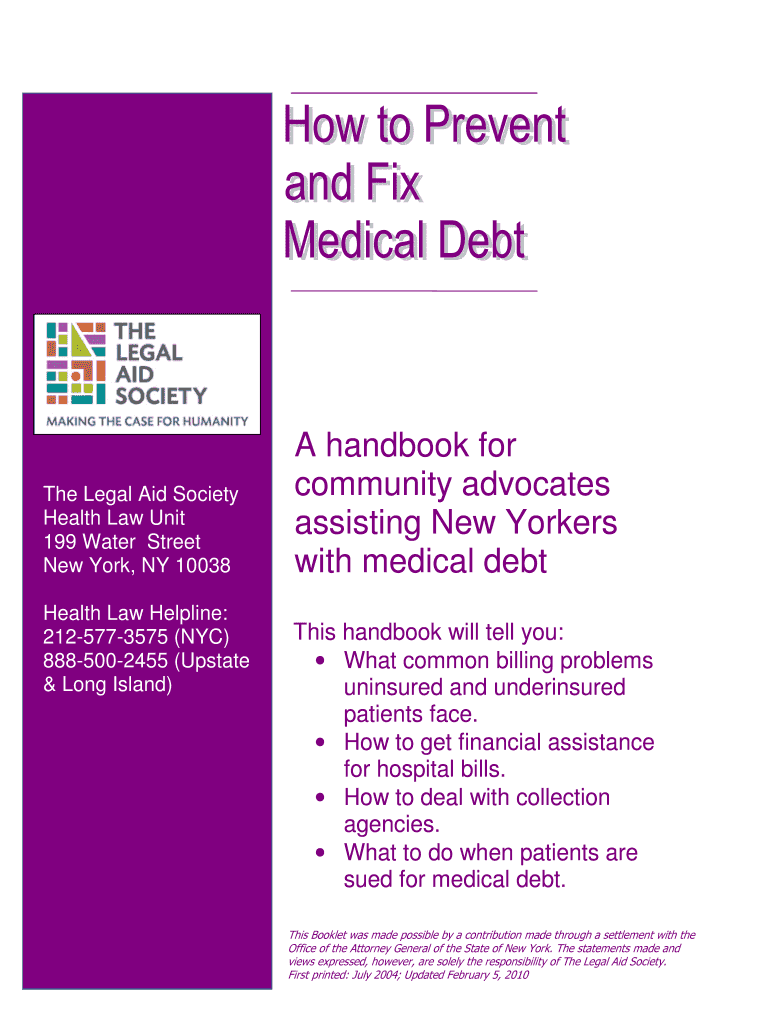 The Legal Aid Society Health Law Unit 199 Water Street New York, NY 10038 Health Law Helpline: 2125773575 (NYC) 8885002455 (Upstate & Long Island) A handbook for community advocates assisting New