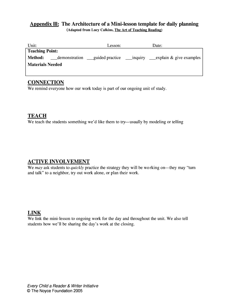 Appendix all: The Architecture of a Minilesson template for daily planning (Adapted from Lucy Catkins, The Art of Teaching Reading Unit: Lesson: Date: Teaching Point: Method: demonstration guided