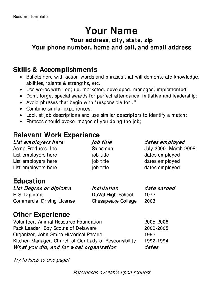 Resume Template Your Name Your address, city, state, zip Your phone number, home and cell, and email address Skills & Accomplishments Bullets here with action words and phrases that will demonstrate