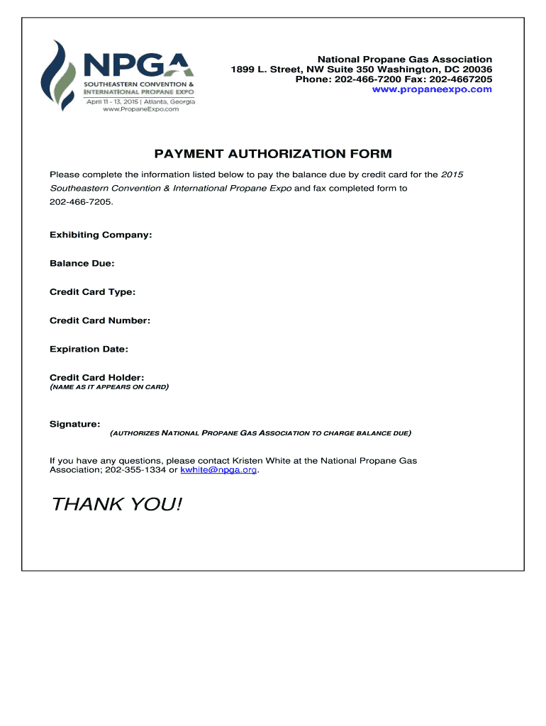 National Propane Gas Association 1899 L. Street, NW Suite 350 Washington, DC 20036 Phone: 2024667200 Fax: 2024667205 www.propaneexpo.com PAYMENT AUTHORIZATION FORM Please complete the information