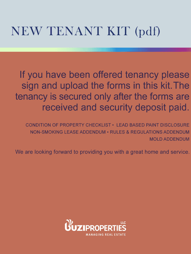NEW TENANT KIT (PDF) If you have been offered tenancy please sign and upload the forms in this kit. The tenancy is secured only after the forms are received and security deposit paid. CONDITION OF