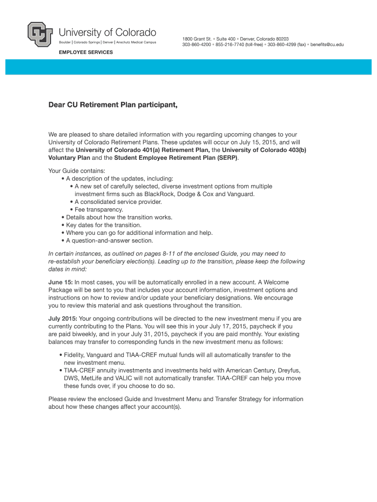 1800 Grant St. Suite 400 Denver, Colorado 80203 3038604200 8552167740 (toll-free) 3038604299 (fax) benefits cu. Eddie CU Retirement Plan participant, We are pleased to share detailed information with