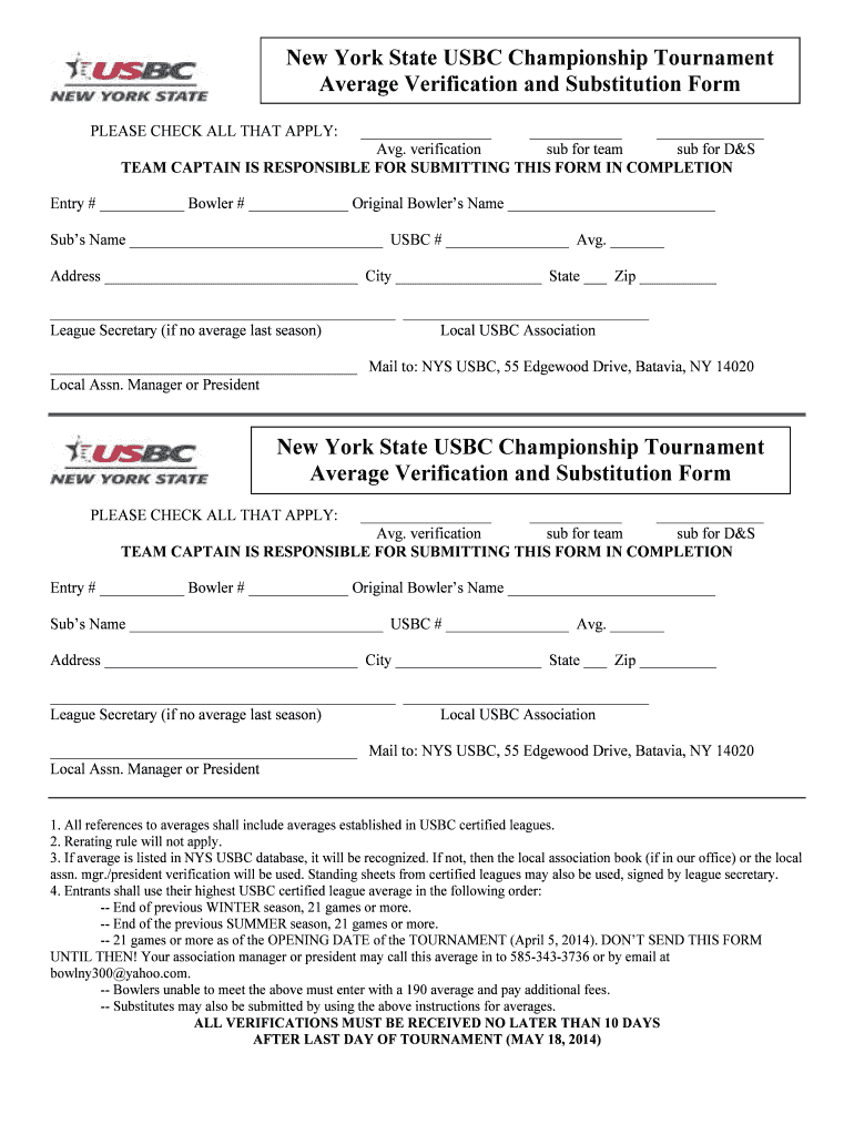 New York State USB Championship Tournament Average Verification and Substitution Form PLEASE CHECK ALL THAT APPLY: Avg. Verification sub for team sub for D&S TEAM CAPTAIN IS RESPONSIBLE FOR SUBMITTING