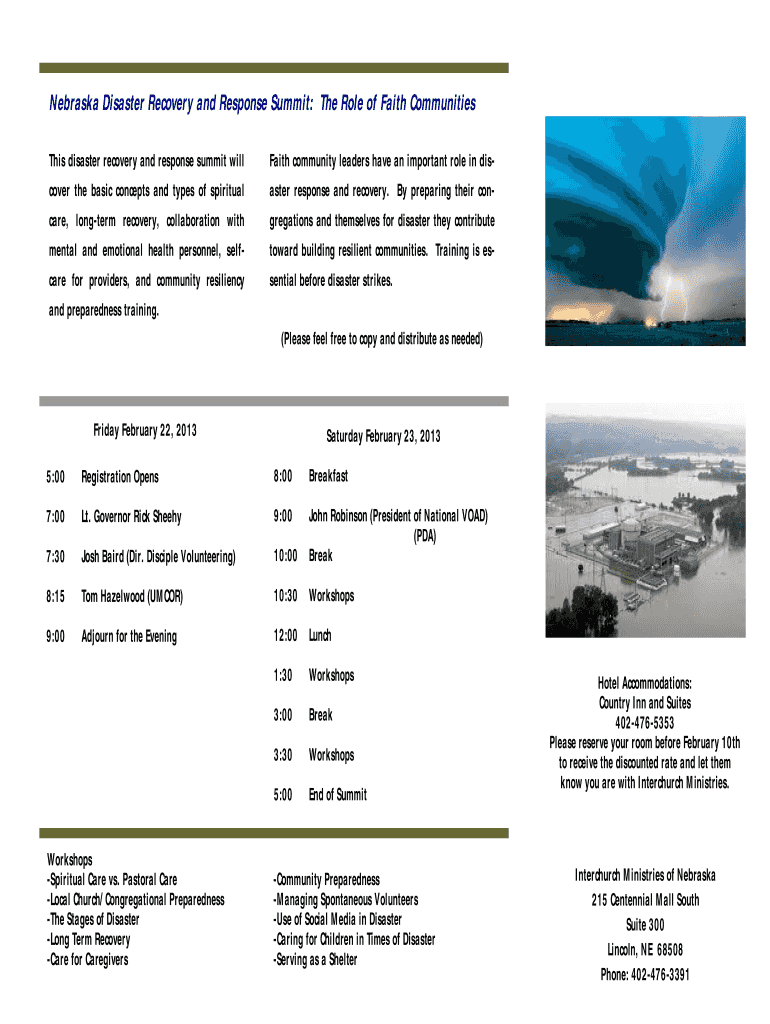 Nebraska Disaster Recovery and Response Summit: The Role of Faith Communities This disaster recovery and response summit will Faith community leaders have an important role in this cover the basic