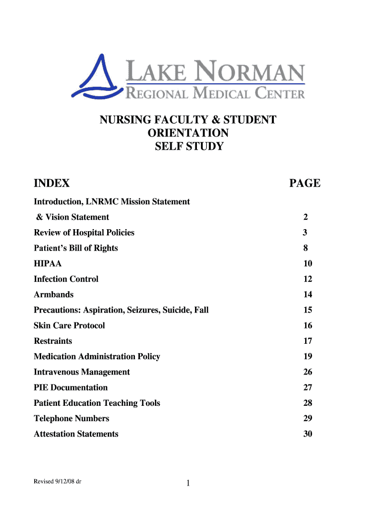 NURSING FACULTY & STUDENT ORIENTATION SELF STUDY INDEX PAGE Introduction, LN RMC Mission Statement & Vision Statement 2 Review of Hospital Policies 3 Patients Bill of Rights 8 HIPAA 10 Infection Control