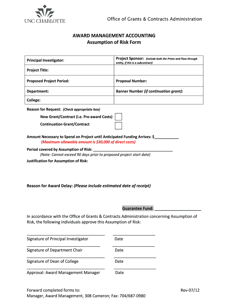 Get the free AWARD MANAGEMENT ACCOUNTING Assumption of Risk Form - research uncc