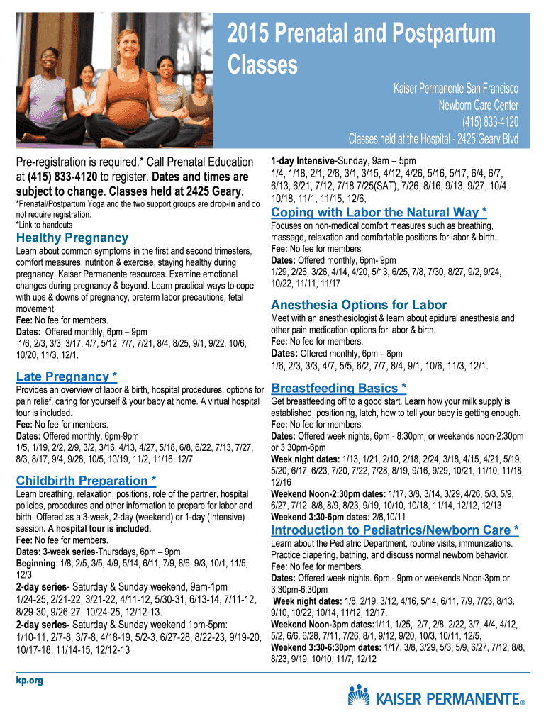2015 Prenatal and Postpartum Classes Kaiser Permanent San Francisco Newborn Care Center (415 8334120 Classes held at the Hospital 2425 Gear BlvdPreregistration is required.* Call Prenatal Education