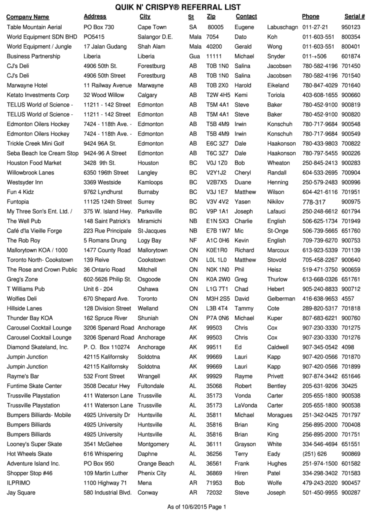 QUICK N CRISPY REFERRAL LIST Company Name Address Table Mountain Aerial PO Box 730 City St Zip Contact Cape Town SA 80005 Eugene Phone Labuschagn 0112721 Serial # 950123 World Equipment SDN BHD PO5415