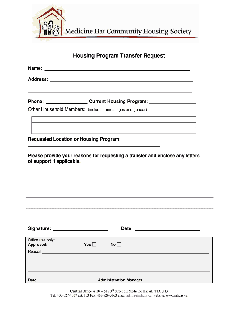 Housing Program Transfer Request Name: Address: Phone: Current Housing Program: Other Household Members: (include names, ages and gender) Requested Location or Housing Program: Please provide your