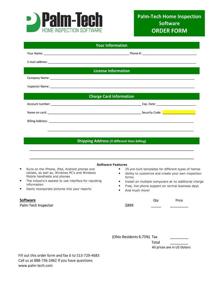 Order form for purchasing Palm-Tech home inspection software, including customer information, license details, charge card information, and software features.
