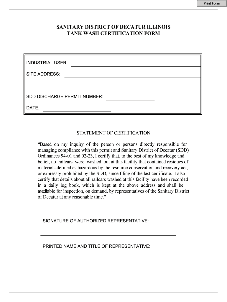 Print Form SANITARY DISTRICT OF DECATUR ILLINOIS TANK WASH CERTIFICATION FORM INDUSTRIAL USER: SITE ADDRESS: SDD DISCHARGE PERMIT NUMBER: DATE: STATEMENT OF CERTIFICATION Based on my inquiry of the