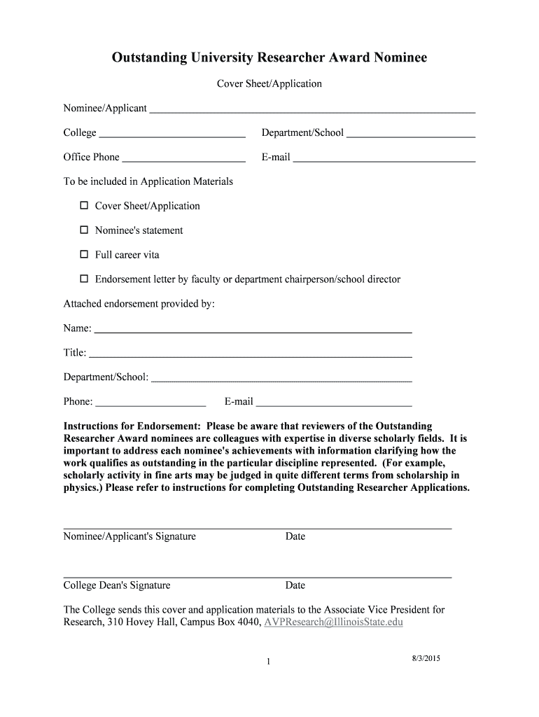 Get the free Outstanding University Researcher Award Nominee - research illinoisstate