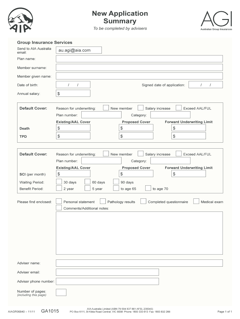 New Application Summary To be completed by advisers Group Insurance Services Send to AIR Australia email: Plan name: Au.AGI aia.com Member surname: Member given name: / / Date of birth: Signed date