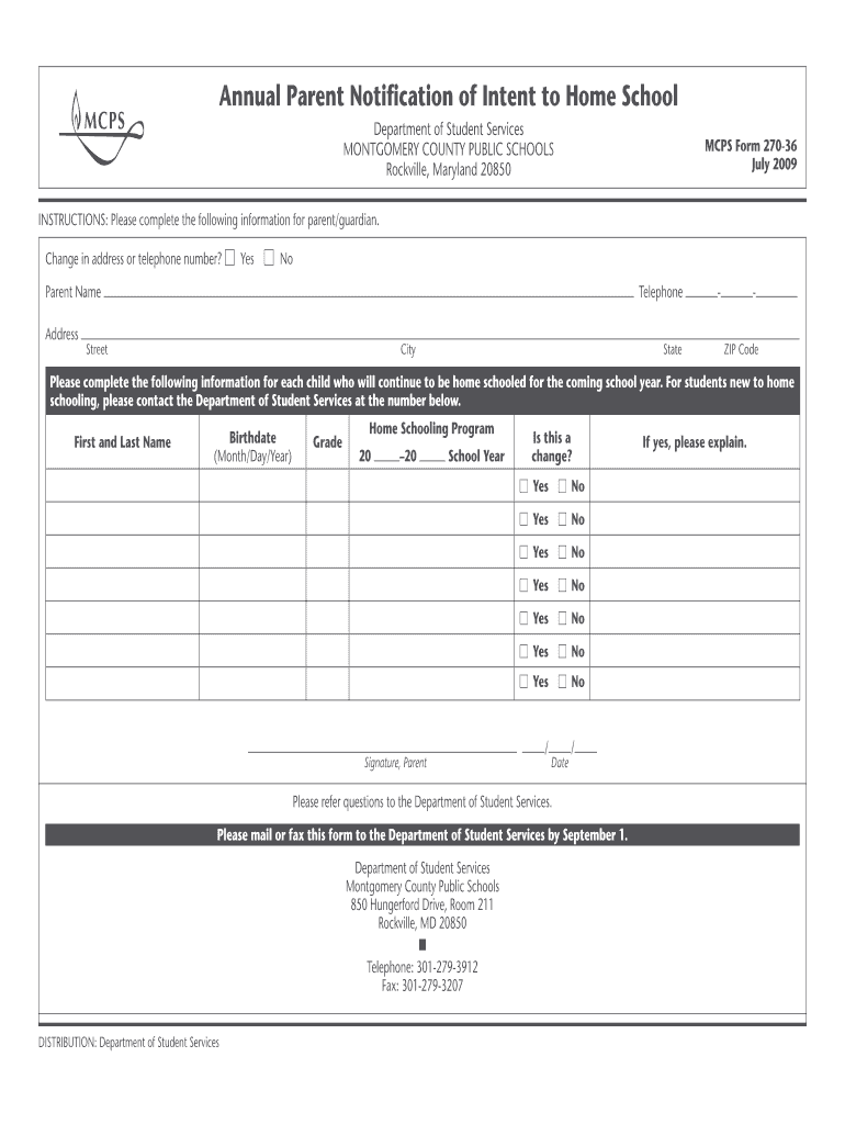 Annual Parent Nomination of Intent to Home School Department of Student Services MONTGOMERY COUNTY PUBLIC SCHOOLS Rockville, Maryland 20850 MCPS Form 27036 July 2009 INSTRUCTIONS: Please complete