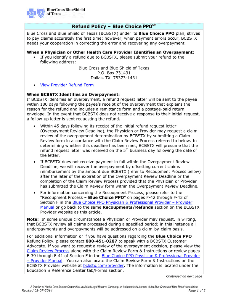This document outlines the refund policy of Blue Cross and Blue Shield of Texas (BCBSTX) under the Blue Choice PPO plan, detailing procedures for identifying and submitting overpayments, refund request