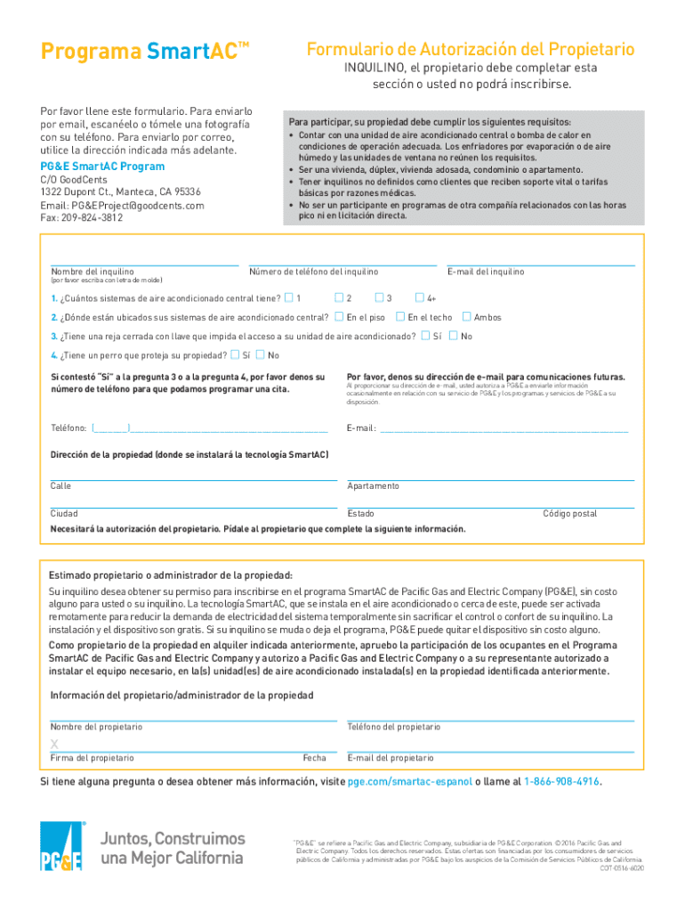 El Programa SmartAC™ Formulario de Autorización del Propietario es un documento utilizado por inquilinos para obtener el consentimiento del propietario para participar en el programa PG&E SmartAC.