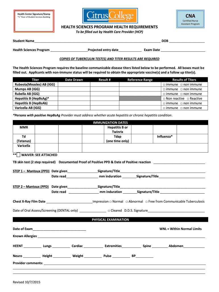 Get the free Health Sciences Program Health Requirements bFormb - Citrus College - citruscollege