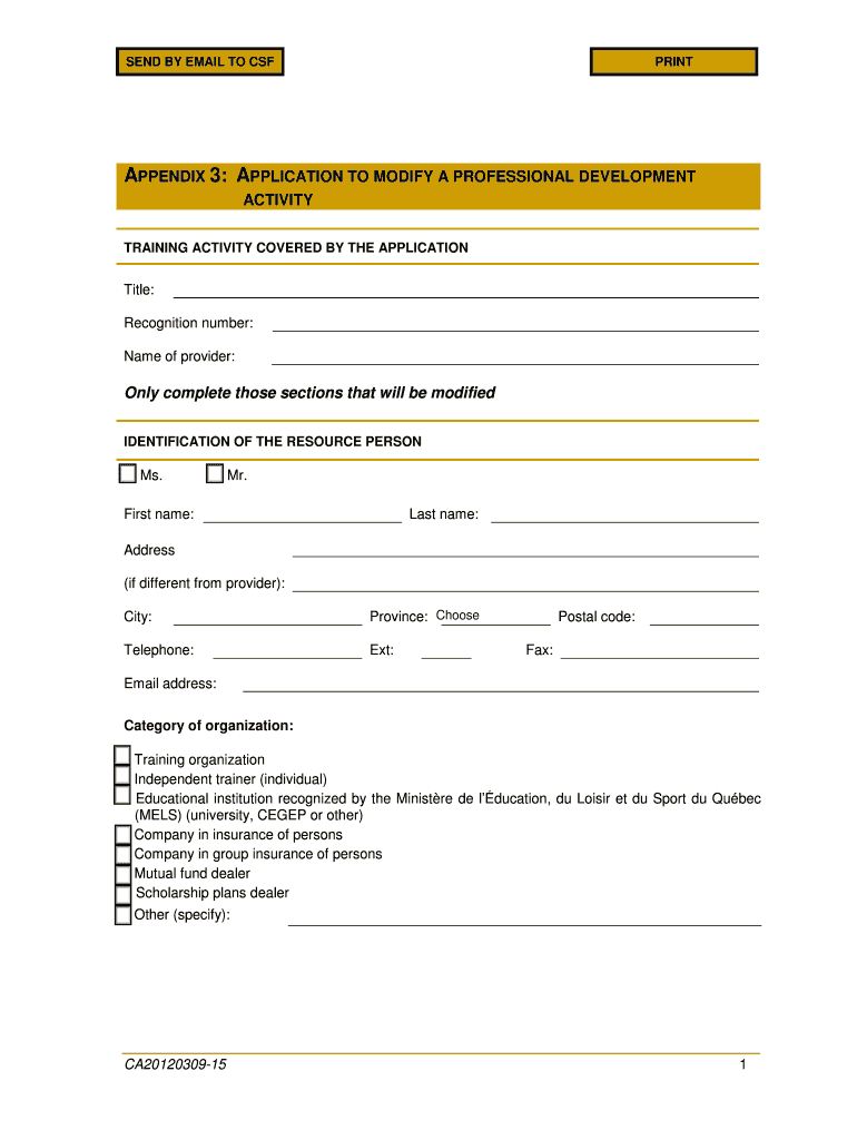 SEND BY EMAIL TO CSF PRINT C APPENDIX 3: APPLICATION TO MODIFY A PROFESSIONAL DEVELOPMENT ACTIVITY S F TRAINING ACTIVITY COVERED BY THE APPLICATION Title: Recognition number: Name of provider: Only