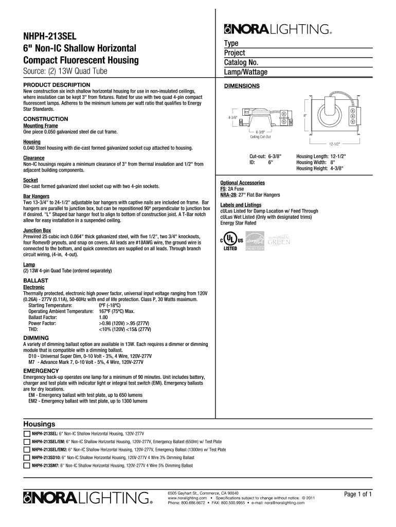 NHPH213SEL 6 Ionic Shallow Horizontal Compact Fluorescent Housing Source: (2× 13W Quad Tube Type Project Catalog No. Lamp×Wattage PRODUCT DESCRIPTION Dimensions New construction six inch shallow