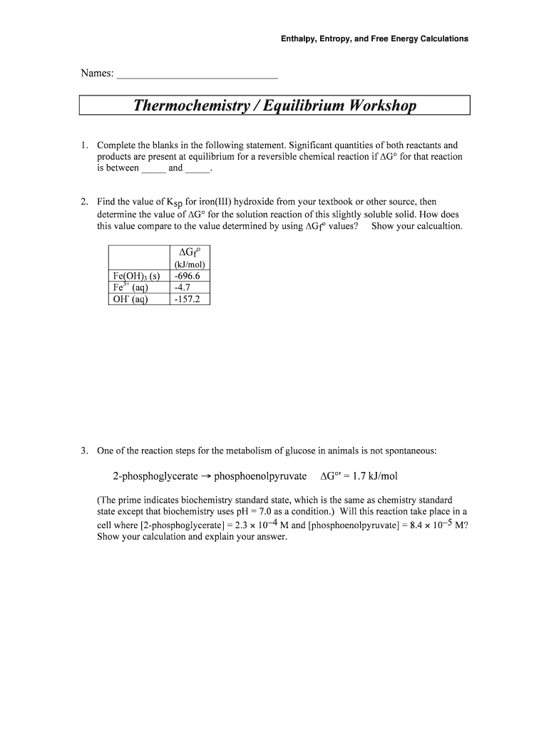 Enthalpy, Entropy, and Free Energy Calculations Names: Thermochemistry / Equilibrium Workshop 1. Complete the blanks in the following statement. Significant quantities of both reactants and products