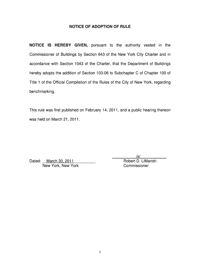 This document provides official notice of the adoption of a new rule by the Department of Buildings of New York City regarding the benchmarking of energy and water use in covered buildings, as mandated