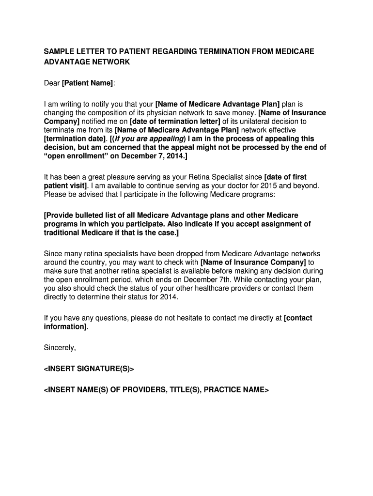 SAMPLE LETTER TO PATIENT REGARDING TERMINATION FROM MEDICARE ADVANTAGE NETWORK Dear Patient Name : I am writing to notify you that your Name of Medicare Advantage Plan is changing the composition