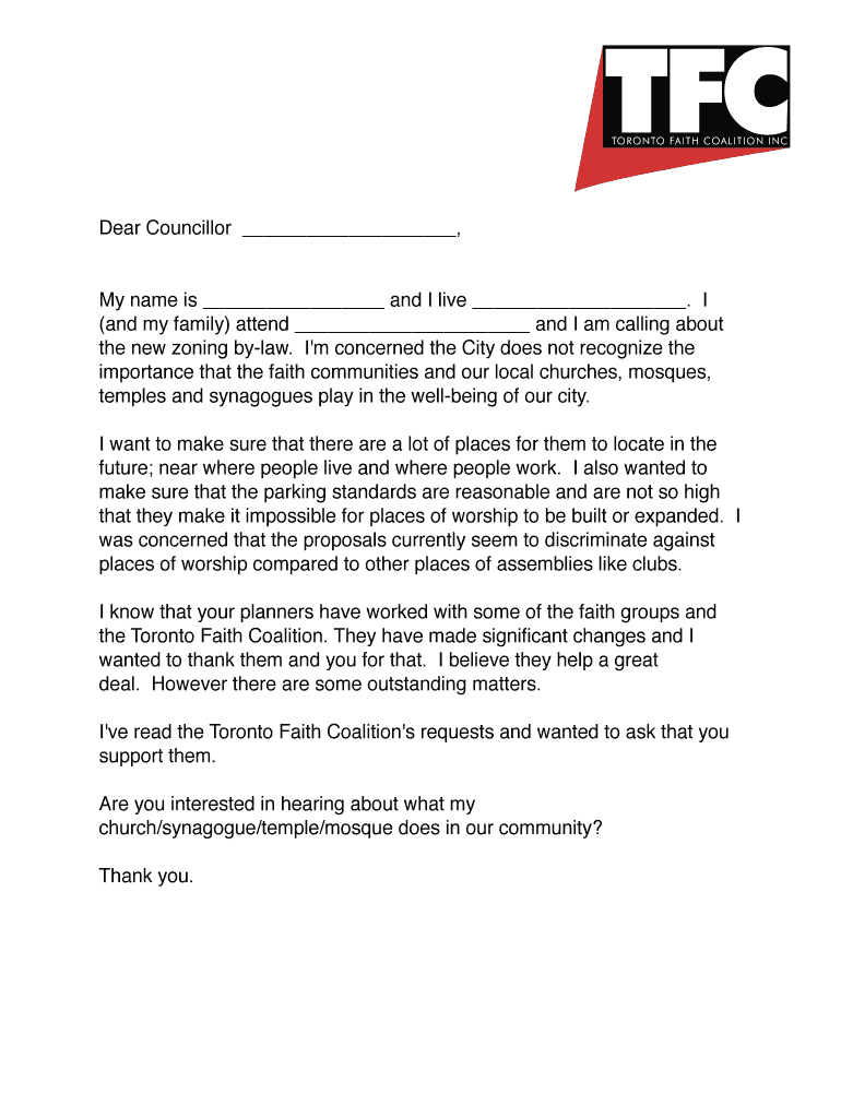 Dear Councillor, My name is and I live. I (and my family) attend, and I am calling about the new zoning bylaw. I'm concerned the City does not recognize the importance that the faith communities and