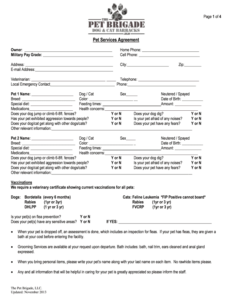 Get the free Pet Services Agreement - The Pet Brigade