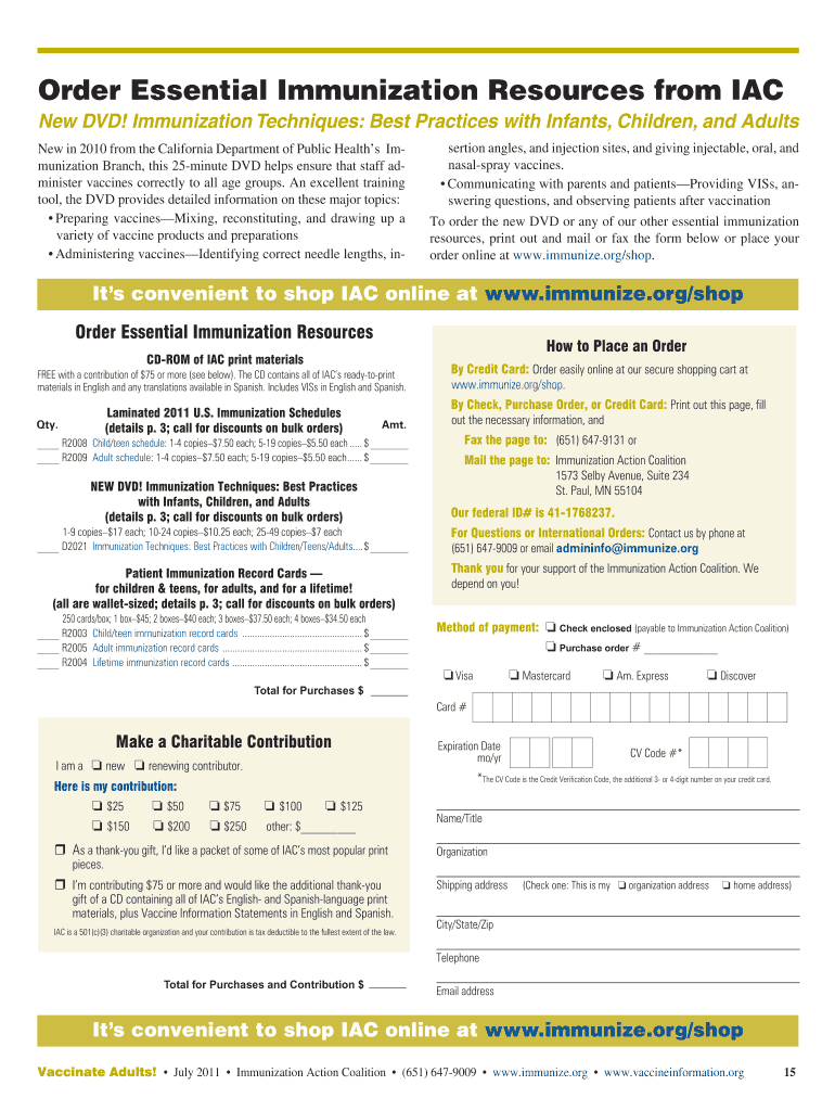 You can order DVDs, CD-ROMs, laminated immunization schedules, and patient immunization record cards through this form.