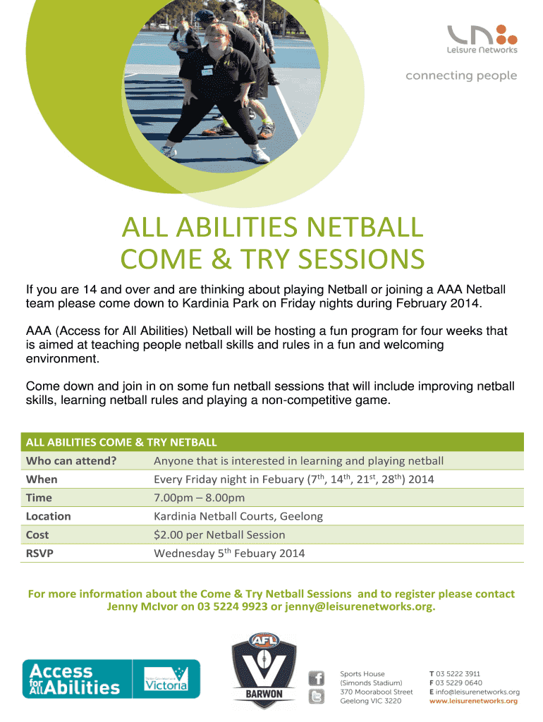 Get the free All abilities netball come & try sessions - AFL Barwon