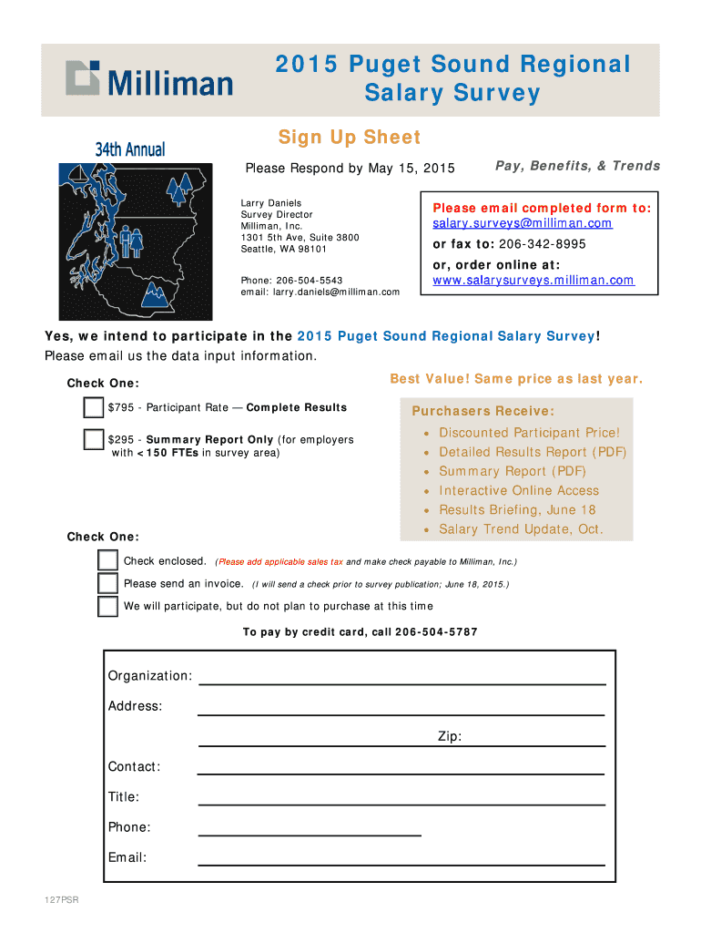 2015 Puget Sound Regional Salary Survey Sign Up Sheet Please Respond by May 15, 2015, Larry Daniels Survey Director Millikan, Inc. 1301 5th Ave, Suite 3800 Seattle, WA 98101 Pay, Benefits, & Trends