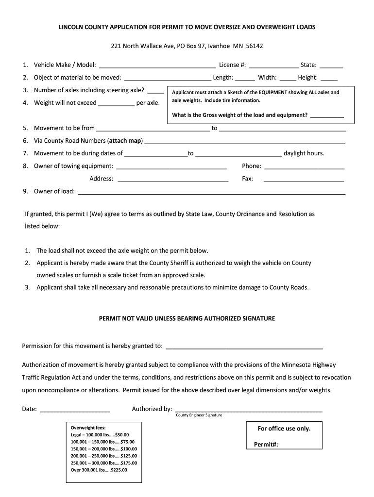 LINCOLN COUNTY APPLICATION FOR PERMIT Moving OVERSIZE AND OVERWEIGHT LOADS 221 North Wallace Ave, PO Box 97, Ivanhoe MN 56142 1. Vehicle Make / Model: License #: State: 2. Object of material to be