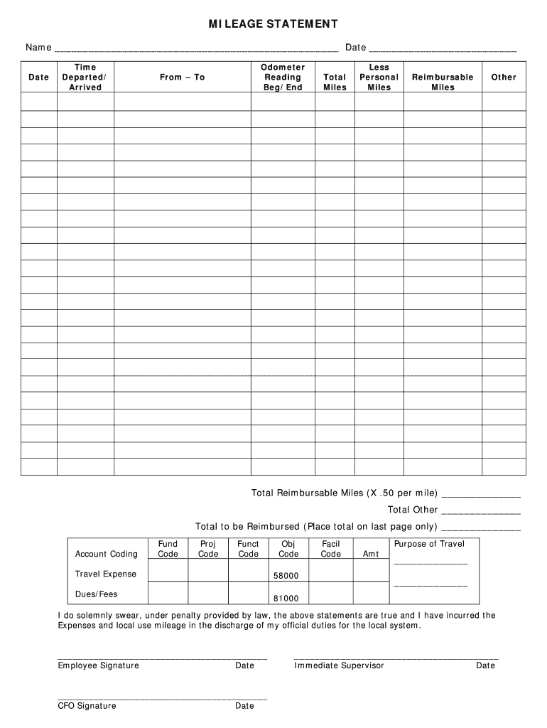 MILEAGE STATEMENT Name Date Time Departed/ Arrived Odometer Reading Beg×End From To Total Miles Less Personal Miles Reimbursable Miles Other Total Reimbursable Miles (X .50 per mile) Total Other