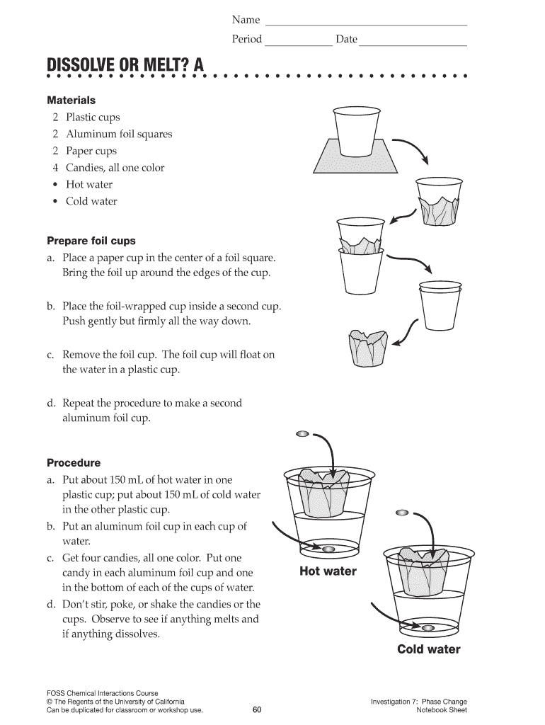 Name Period Date DISSOLVE OR MELT? A Materials 2 Plastic cups 2 Aluminum foil squares 2 Paper cups 4 Candies, all one color Hot water Cold water Prepare foil cups a. Place a paper cup in the center