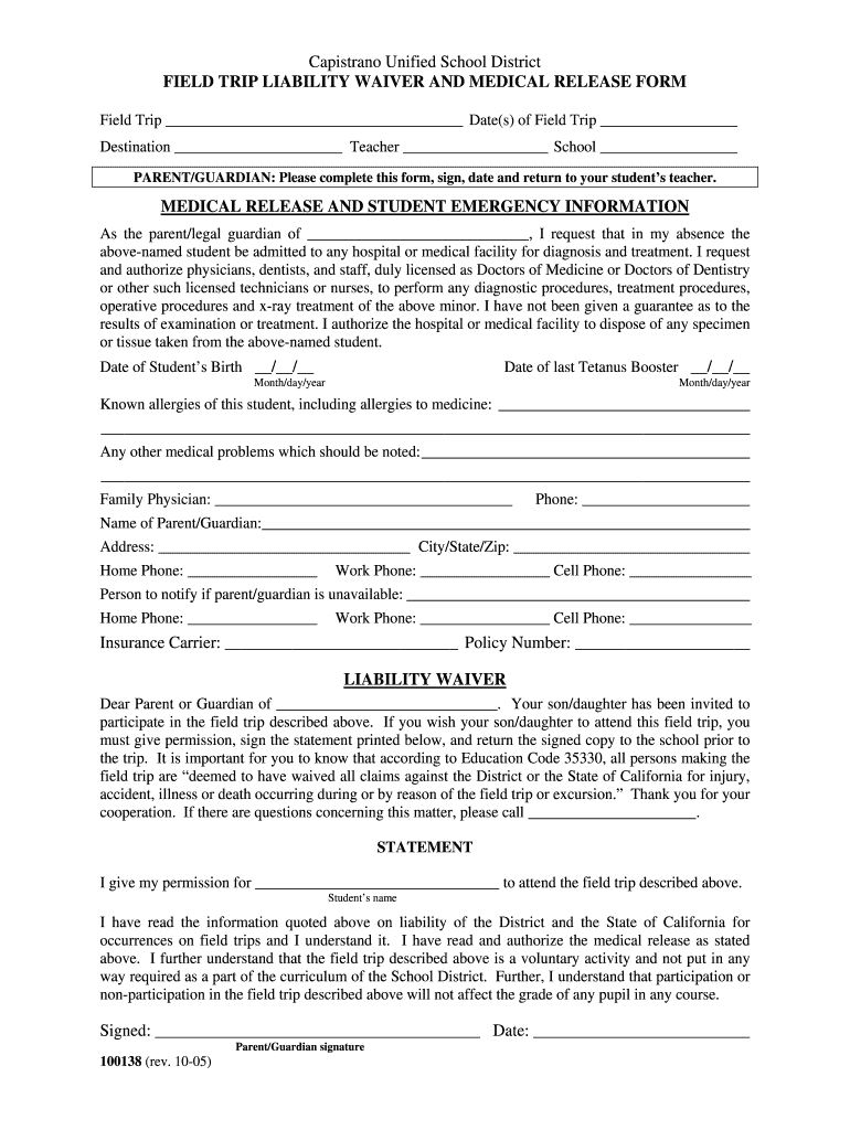 Capistrano Unified School District FIELD TRIP LIABILITY WAIVER AND MEDICAL RELEASE FORM Field Trip Date’s) of Field Trip Destination Teacher School PARENT×GUARDIAN: Please complete this form, sign,