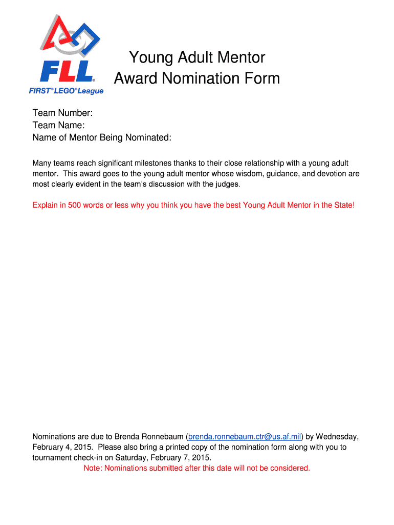 Young Adult Mentor Award Nomination Form Team Number: Team Name: Name of Mentor Being Nominated: Many teams reach significant milestones thanks to their close relationship with a young adult mentor.