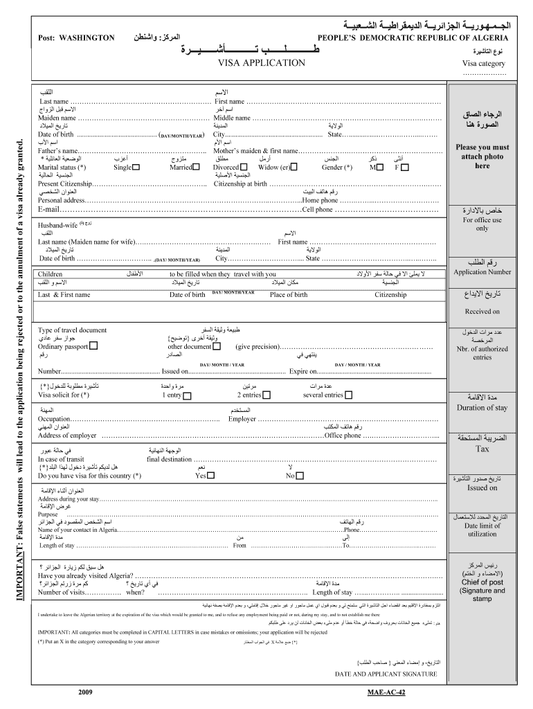 نموذج طلب تأشيرة لدخول الجزائر يتضمن معلومات شخصية وتفصيلية عن المتقدم والجهات المرتبطة به، بالإضافة إلى التوجيهات