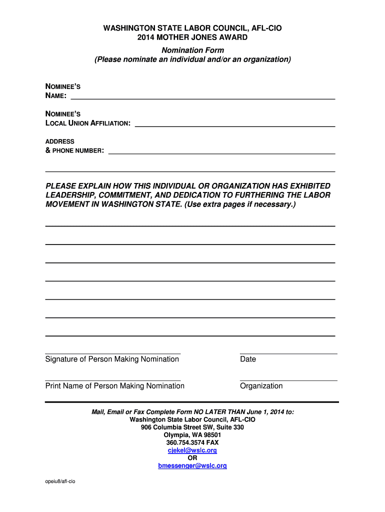 WASHINGTON STATE LABOR COUNCIL, AFL CIO 2014 MOTHER JONES AWARD Nomination Form (Please nominate an individual and×or an organization) NOMINEES NAME: NOMINEES LOCAL UNION AFFILIATION: ADDRESS & PHONE