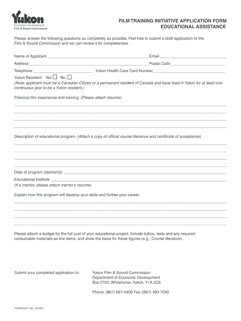 FILM TRAINING INITIATIVE APPLICATION FORM EDUCATIONAL ASSISTANCE Economic Development Film & Sound Commission Please answer the following questions as completely as possible. Feel free to submit a
